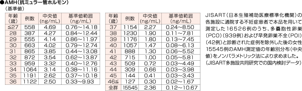 AMH検査結果は、個人差が大きいため正常値は設定されていません。若い女性でも低い場合や高齢の女性でも高い場合があるので、測定値からのいわゆる「卵巣年齢」の推定はできないと言われています。