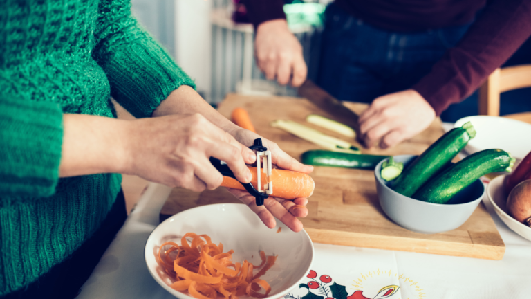 - 赤・黄パプリカ、にんじんは細切りに、ほうれん草はざく切りにする。