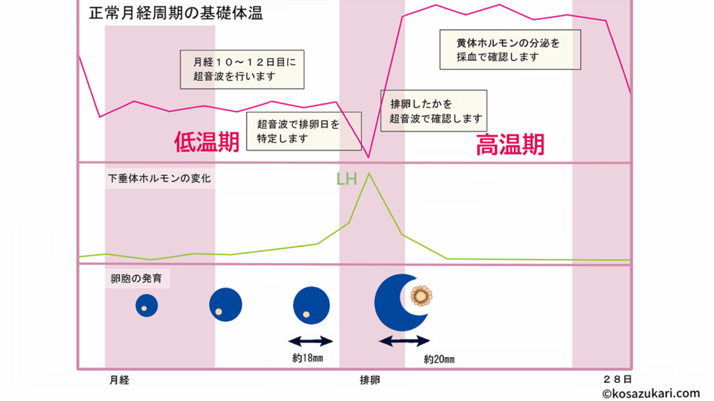 毎朝、基礎体温を表につけ、排卵日近くに通院をし、超音波検査で 卵胞 の生育状態を観察し、排卵日を予測します。卵胞 は1日に1~2mmずつ大きくなり、直径が18~22mmになると排卵します。卵胞の大きさをから正確な排卵日を予測します。