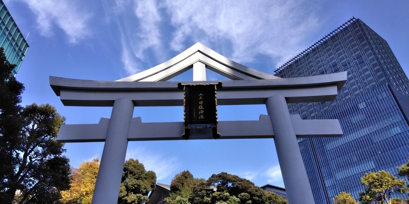 周囲を見渡すと都心の高層ビル群に囲まれる近代的な建造物と古くからこの地に存在する神社が不思議なバランスで溶け込んでいます。
