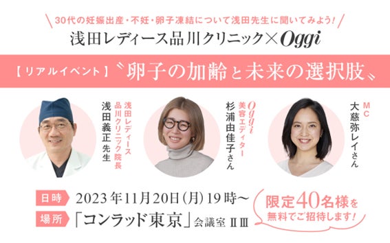 不妊治療専門のクリニック 医療法人浅田レディースクリニック(所在地:東京都港区他全国3院)は、11月20日(月)19時よりコンラッド東京にて、Oggi(小学館)とのコラボイベント「卵子の加齢と未来の選択肢」を限定40名様対象に開催いたします。これに伴い、10月16日(月)より応募フォームにて募集を開始いたします。