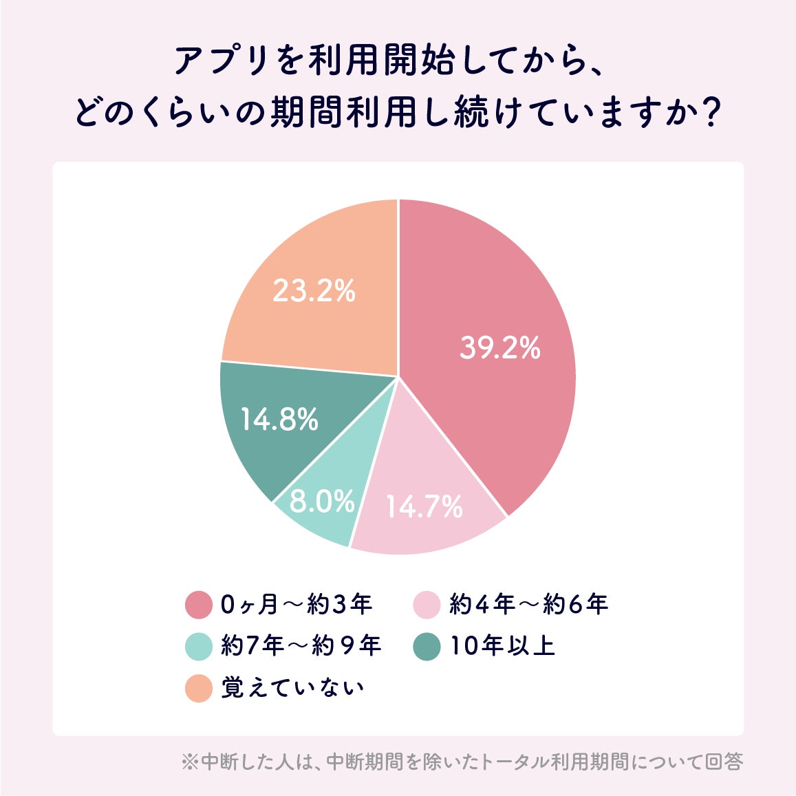 また累計2,000万ダウンロード突破を記念して、『ルナルナ』アプリの利用実態についてのアンケート調査※2も実施しました。アプリのトータルの利用年数を聞いたところ、覚えていないと回答するユーザーも一定数いましたが、利用年数として最も多かったのは「0ヶ月〜約3年」で39.2%、次いで「10年以上」14.8%、「約4年〜約6年」14.7%でした。1割強のユーザーが10年以上利用しているという結果に、とてもうれしく思います。