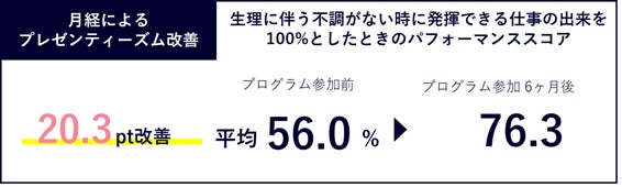 昨年の試験導入では、「生理に伴う不調がない時に発揮できる仕事の出来を100%としたときのパフォーマンススコア」がプログラム参加前は平均56.0%だったのに対し、参加後は平均76.3%と20ポイント以上向上しました。また、月経を理由に1カ月間で欠勤する日数も、参加前の平均0.2日から参加後は0日になるなどの成果が見られました。※2