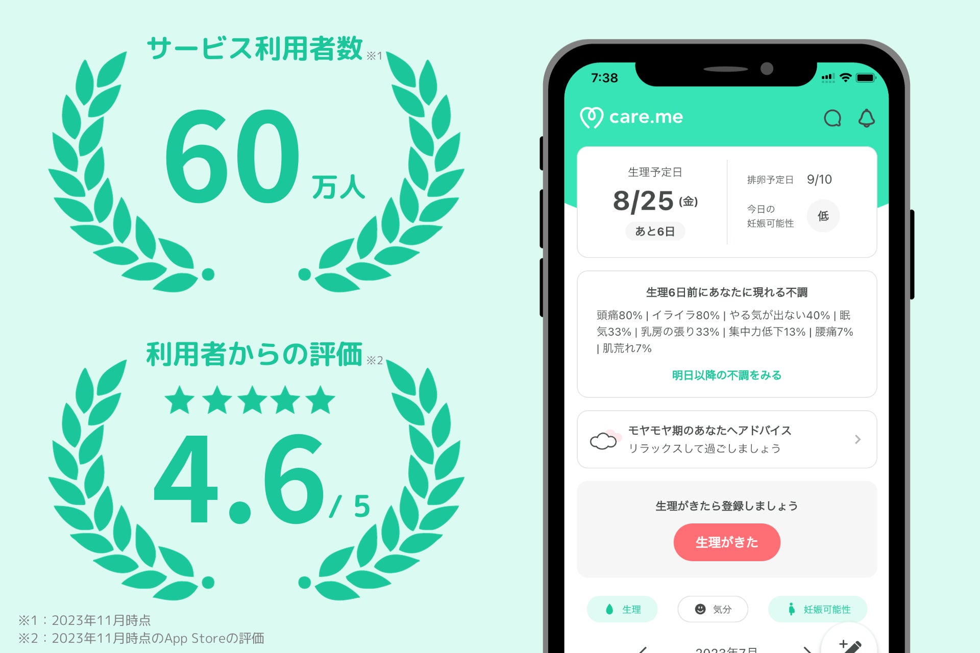 ケアミーは2020年5月にサービスを開始し、利用者数は2021年5月に4.5万人、2022年6月に30万人、2023年11月に60万人を突破しました。ケアミーは、独自開発した予測モデルを用いて、利用者のPMSの症状を分析し、これから起こる不調を予測する機能を有しています。これにより、利用者は自身のPMSを理解し、適切な対策を取ることができます。また、PMSによる体や心の変化をLINEでパートナーに共有することもできます。多くの女性とそのパートナーから、これらの機能に対して満足の声をいただいており、アプリストアの5段階評価では4.6という高い評価を獲得しています。