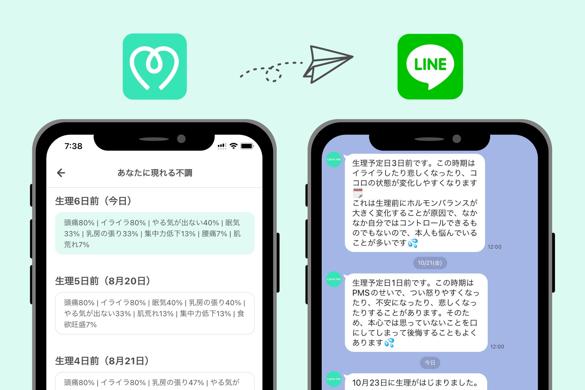 ケアミーのペアリング機能は、PMSによる利用者の体や心の変化をLINEでパートナーに共有します。産婦人科医監修の基礎知識も通知されるため、パートナーのPMSに対する理解も深まります。これにより、利用者の「自分からは伝えづらく、パートナーにPMSのことを理解してもらえない」という悩みを解決します。