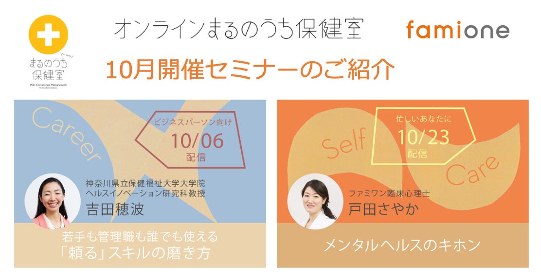 「子どもを願うすべての人によりそい 幸せな人生を歩める社会をつくる」をビジョンに掲げ、LINEを活用した妊活コンシェルジュサービス「famione(ファミワン)」 https://lp.famione.com/ を提供する株式会社ファミワン(本社:東京都渋谷区、代表取締役:石川勇介、以下当社)は、三菱地所株式会社(本社:東京都千代田区、執行役社長:中島 篤氏、以下三菱地所)が進めるプロジェクト「まるのうち保健室」との共創プログラム「オンラインまるのうち保健室 supported by famione」を運営しており、10月のセミナー配信内容が決定いたしました。