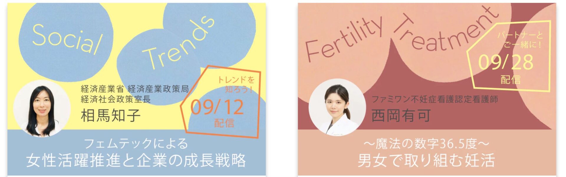 9月のセミナーは12日に経済産業省経済社会政策室室長相馬知子氏、28日に株式会社ファミワン西岡有可が登壇しました。相馬氏のセミナーでは経済産業省で取り組んでいる、女性の健康課題を解決し得る「フェムテック」の活用についてお話しいただきました。西岡のセミナーでは妊活についての基礎知識、また、管理栄養士も動画で講演し、栄養・食生活から体や内臓の温度を高める方法をお話しました。いずれのセミナーもアーカイブ配信を実施しています。