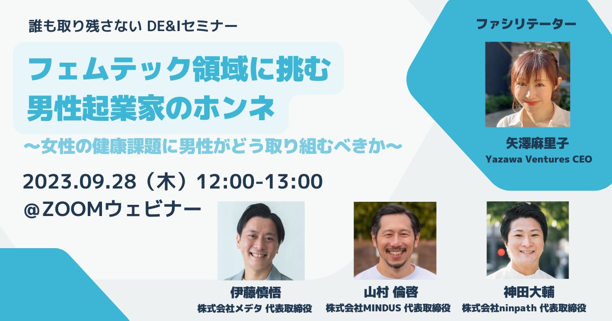 不妊治療可視化アプリ「ninpath」を提供する株式会社ninpath(本社:東京都港区、代表取締役CEO:神田大輔)は無料オンラインセミナー「フェムテック領域に挑む男性起業家のホンネ 〜女性の健康課題に男性がどう取り組むべきか〜」を開催いたします。誰もが働きやすい社会を実現するために、女性の健康課題に男性がどう取り組むべきかをテーマに、フェムテック領域での事業を展開する3社の男性起業家が登壇します。