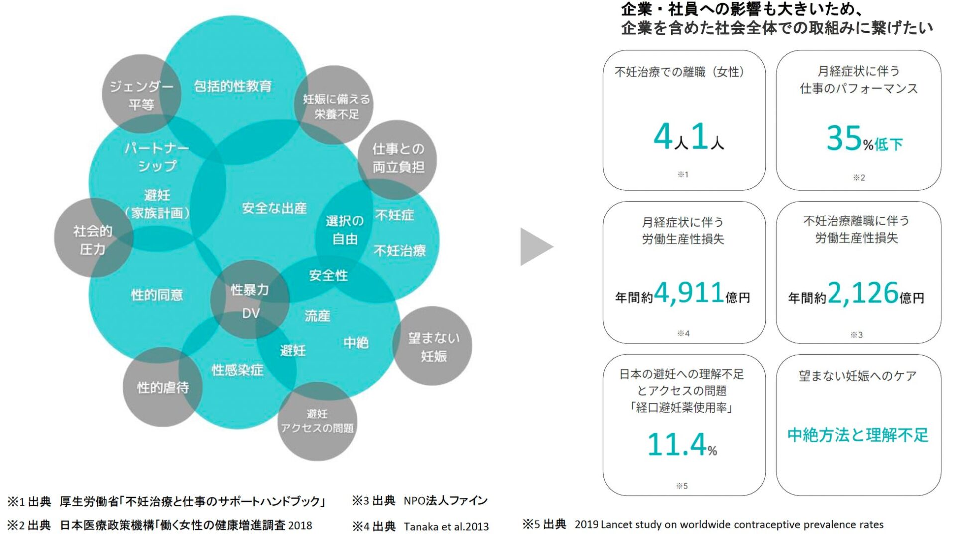 リプロダクティブヘルスとは、「性や生殖に関わるすべてにおいて、⾝体的にも精神的にも社会的にも本⼈の意思が尊重され、⾃分らしく⽣きられること」を指します。この概念は、1994年にエジプト・カイロで開催された国際⼈⼝開発会議において提唱されました。日本でも、国の施策として、内閣府の男女共同参画局では「生涯を通じた女性の健康支援*」にリプロダクティブヘルスに関する意識の浸透や対策の推進などを掲げていますが、この⽤語が提唱されて30年近くを経た現在も、認知度や関⼼が低いために、ほとんど議論や改善がされていません。世界的に見ても周回遅れにて、多くの課題が残っています。すべての⼈の権利が守られ、安⼼・安全・健康な⽣活を送るために企業を含めた社会全体での取り組みが必要とされています。