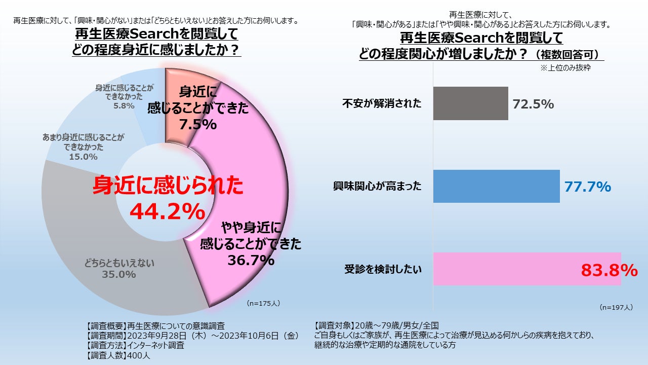 さらに、既に関心が高かった方や、再生医療の受診を検討していた方々の72,5%が「不安が解消された」と回答しており、77,7%が「興味関心が高まった」、83,8%が「受診を検討したい」と回答しました。