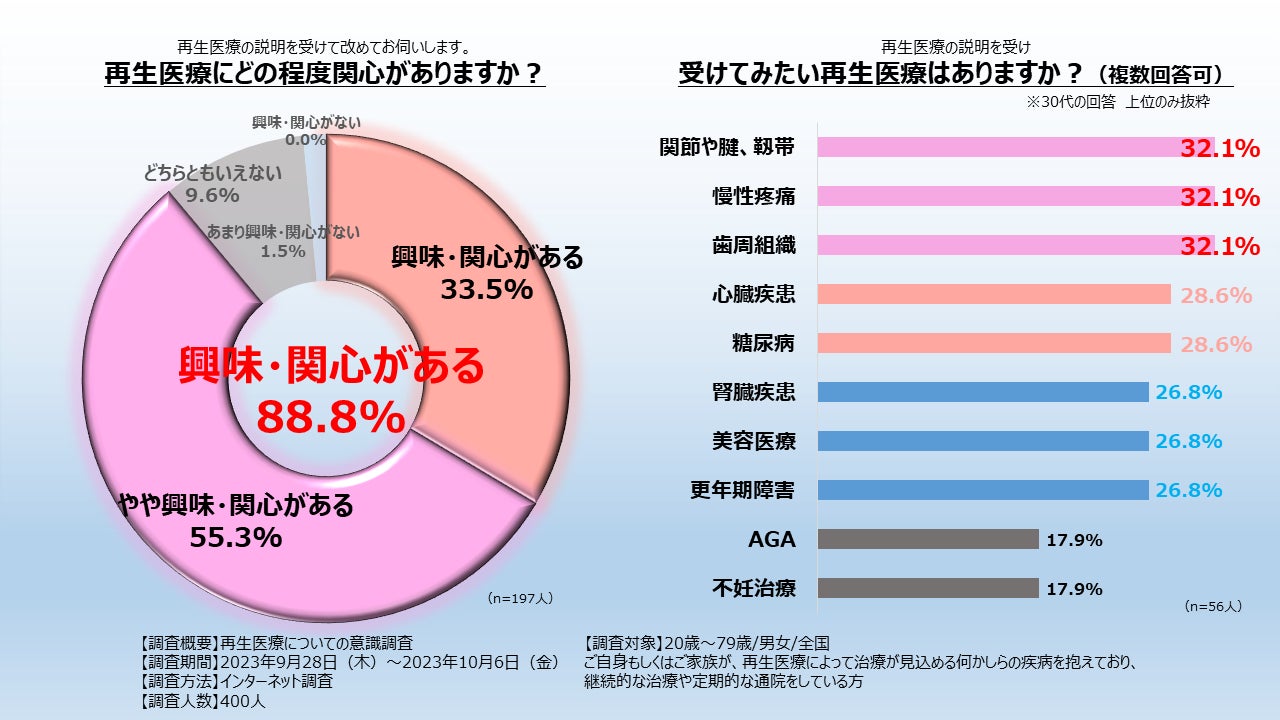 特に、既存の治療法では改善、または治癒が見込めなかった病気や機能低下が、再生医療によって改善、または治癒が見込めることに、ほぼ全員が魅力を感じていることが明らかになりました。
