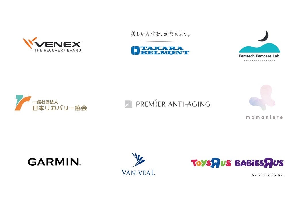 株式会社ベネクス/タカラベルモント株式会社/株式会社大広(大広フェムテック・フェムケアラボ)/一般社団法人日本リカバリー協会/プレミアアンチエイジング株式会社/株式会社ポーラ/ガーミンジャパン株式会社/株式会社ビ・メーク/日本トイザらス株式会社(順不同)