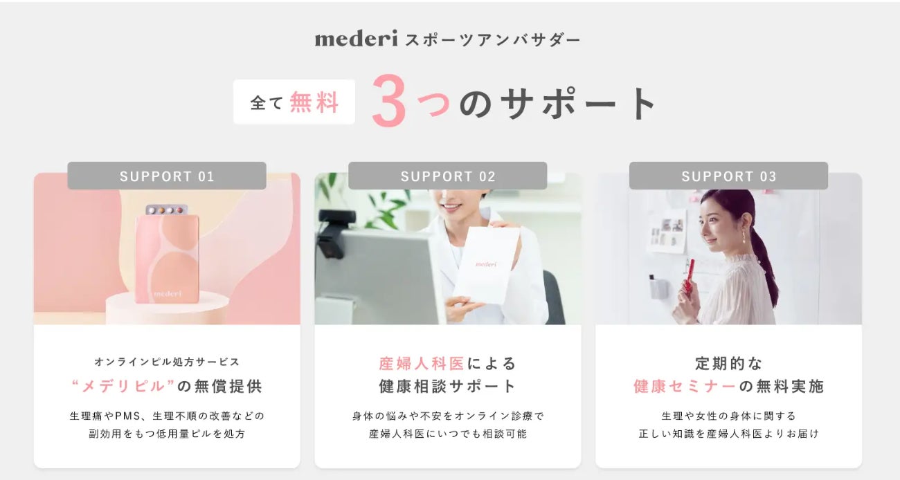mederiスポーツアンバサダーに採用された女子スポーツチームには、2023年から約1年間、選手への個別オンラインピル処方、産婦人科医による健康相談サポートのほか、年4回実施予定の健康セミナーなど、選手・指導者双方がご参加いただけるプログラムを無償でご利用いただける特典を提供いたしました。