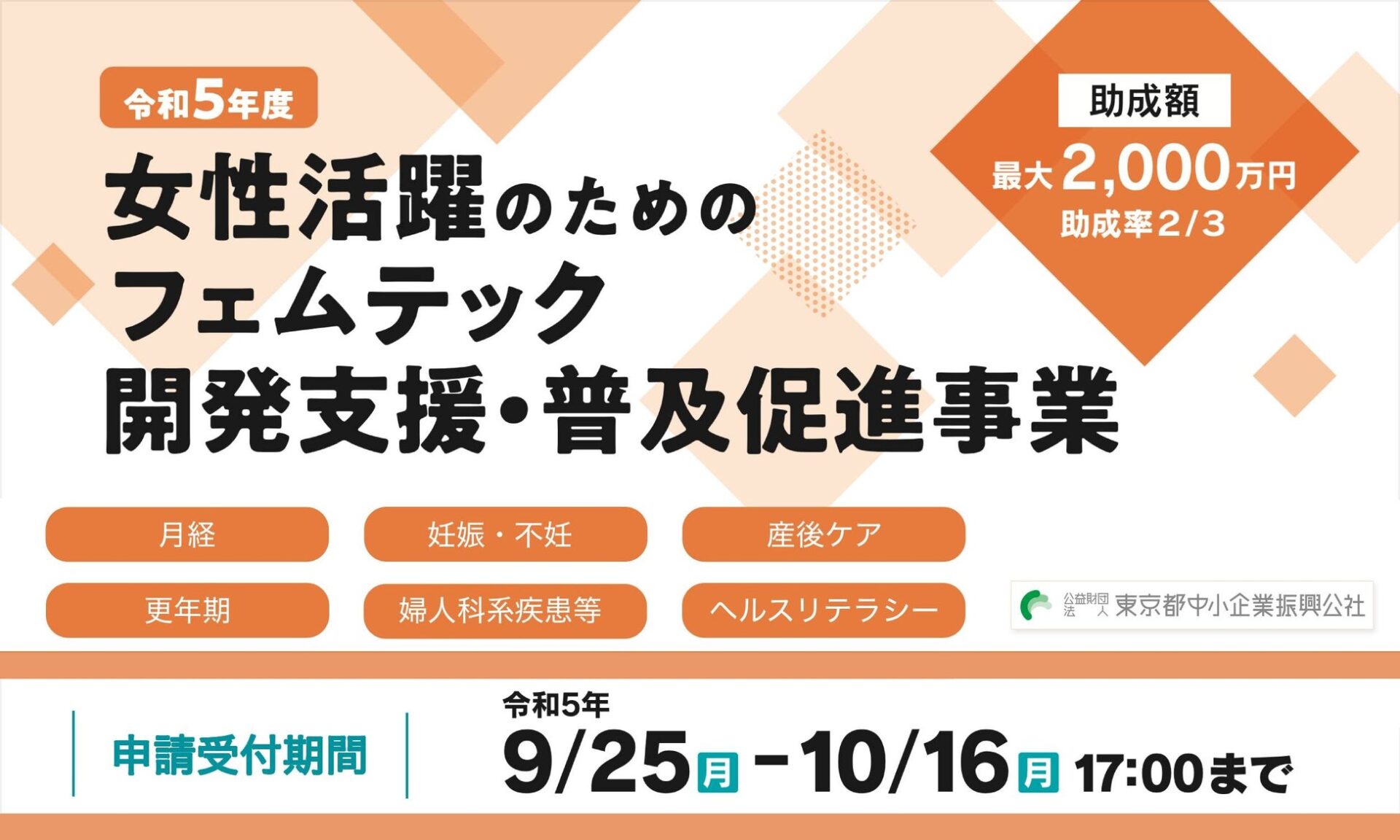 公益財団法人 東京都中小企業振興公社(本社:東京都千代田区、理事長:中西 充)は、都内中小企業者等を対象に、女性の健康課題を解決するための新製品等の開発・改良・普及を支援する「女性活躍のためのフェムテック開発支援・普及促進事業」の申請受付を9月25日(月)から開始します。