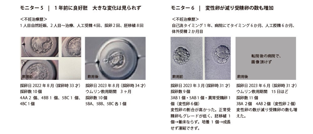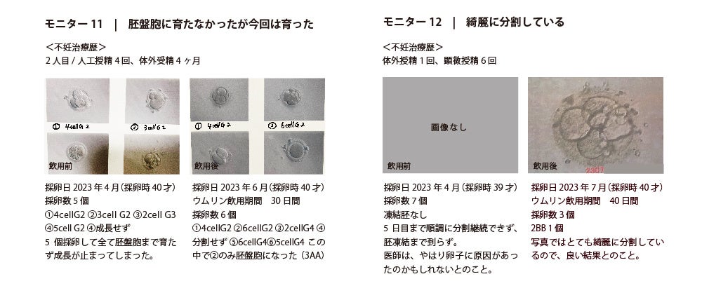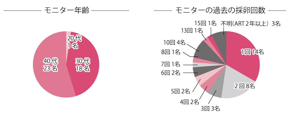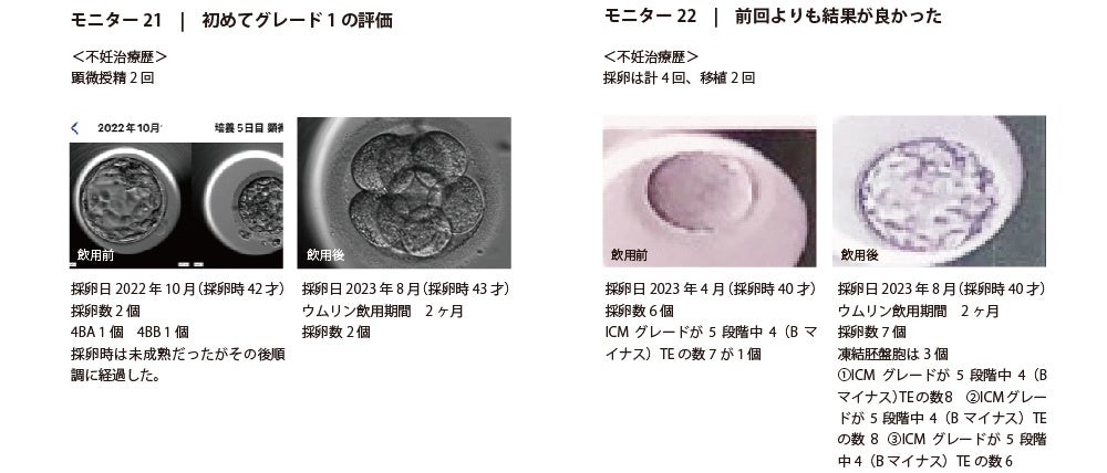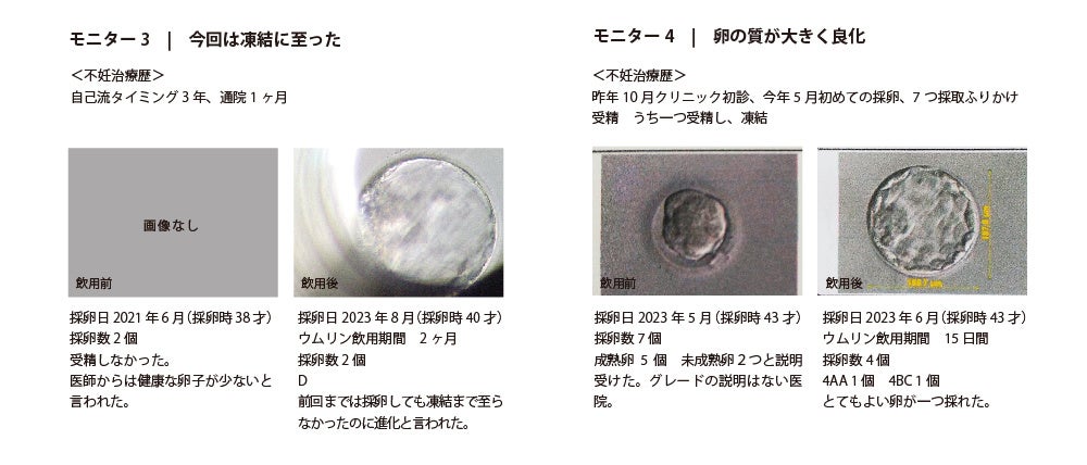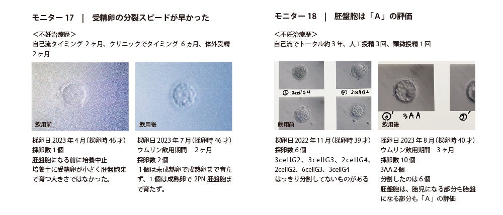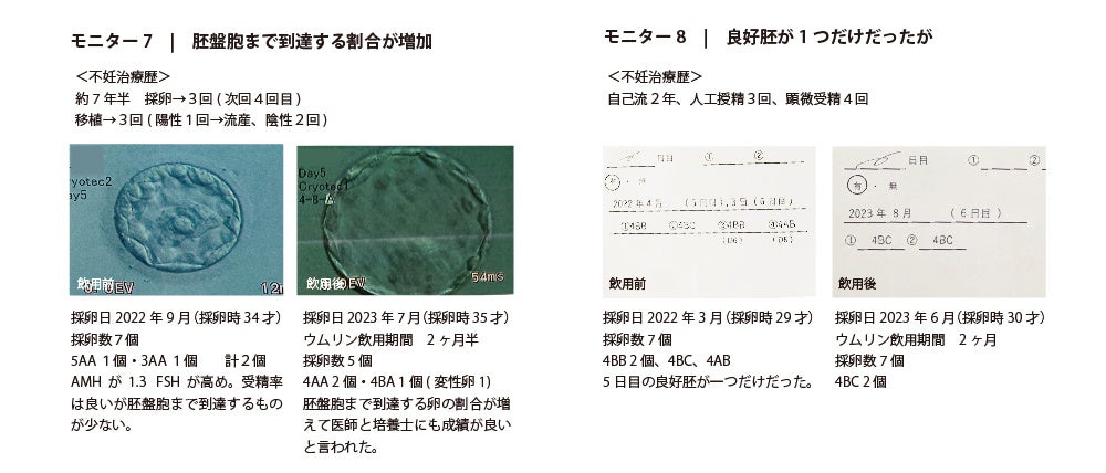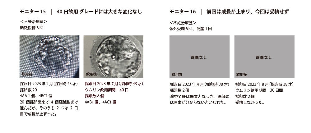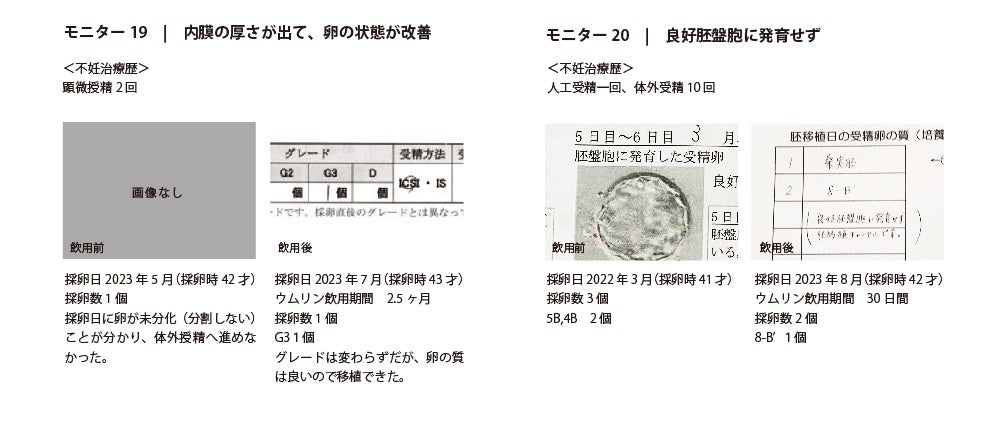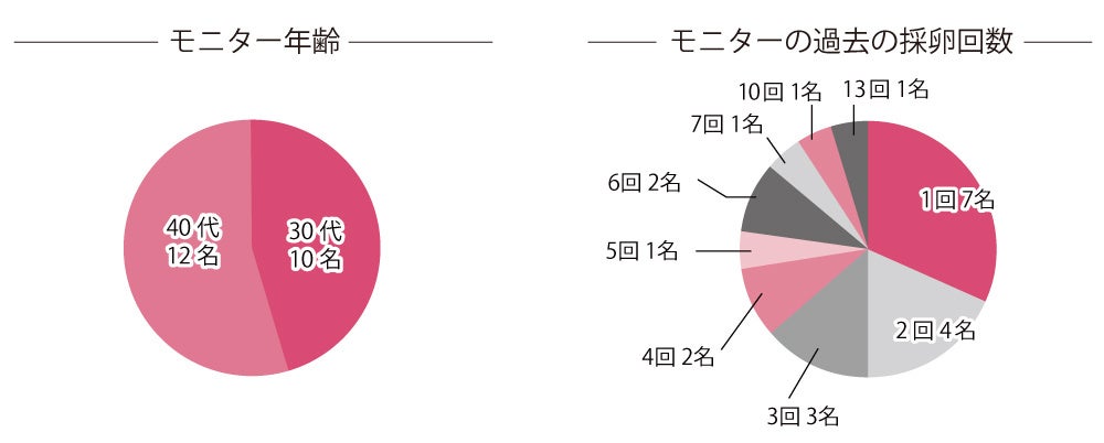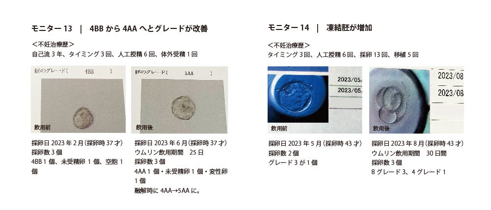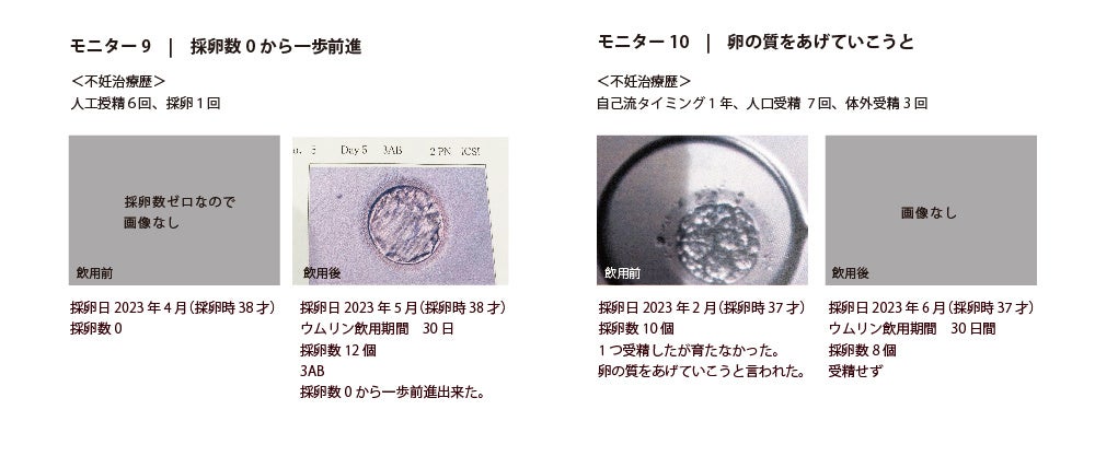 「ラルーン」にて、過去に1回以上採卵経験があるなどの要件を満たす20名のモニターを募集、2023年6月~2023年8月まで各自の採卵スケジュールに合わせてウムリン24ml/dayを15〜90日間飲用し、前後の採卵データを提出依頼しました。(9月末時点での回答は22名)