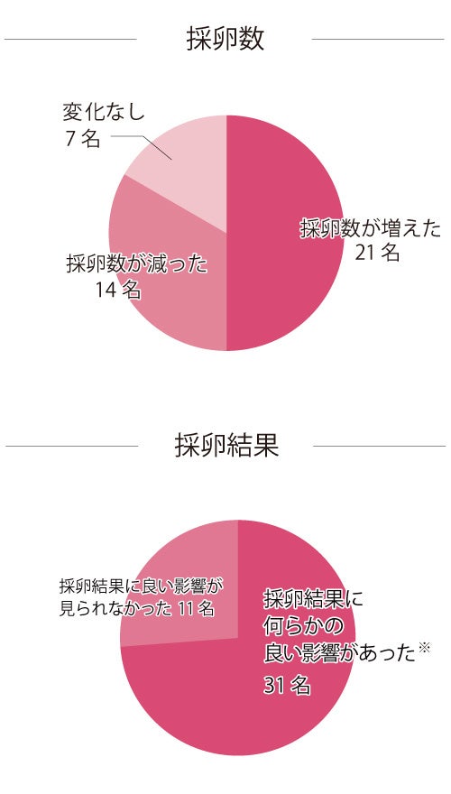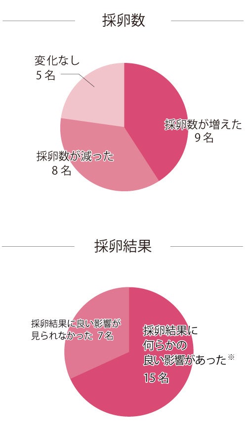 ※何らかの良い影響…受精卵・胚盤胞のグレードが上がった、採卵数が増えた、凍結胚が増えた、卵の育ちが早くなった、変性卵が減ったなど