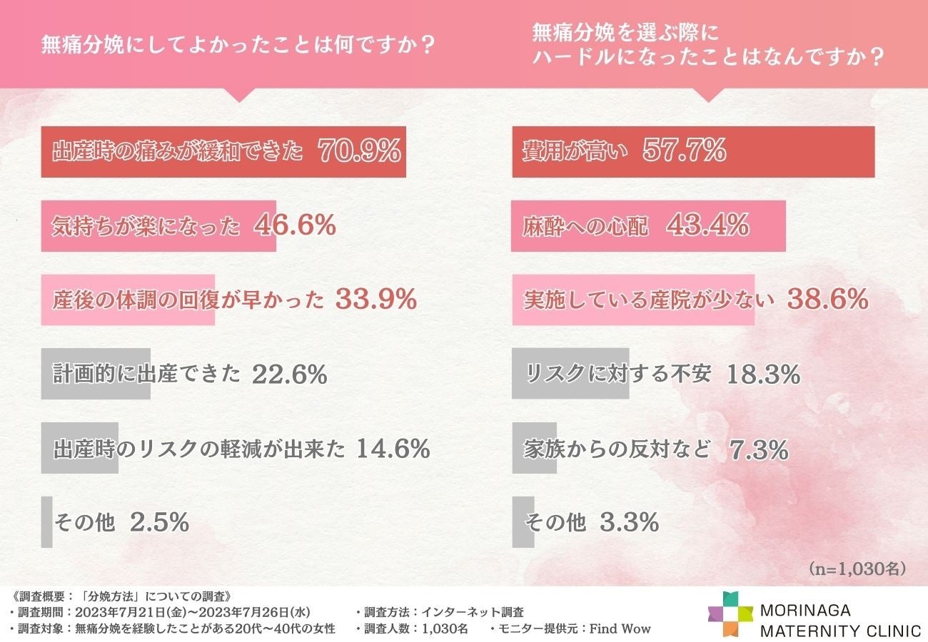 医療法人 森永産婦人科(本社所在地:愛知県春日井市、院長:森永康文)は、無痛分娩を経験したことがある20代~40代の女性1,030名を対象に、「分娩方法」についての調査を実施しました。