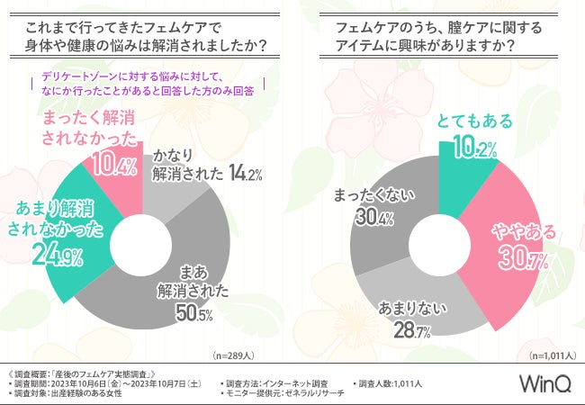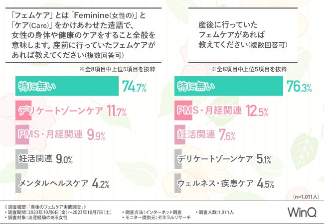 株式会社WinQ(所在地:東京都渋谷区、代表取締役:相馬愛果)は、出産経験のある女性を対象に、「産後のフェムケア実態調査」を実施しました。