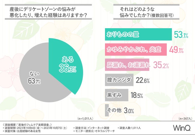 • 3割以上が産後にデリケートゾーンの悩みが悪化!特に困ったのは「おりものの量」「かゆみやかぶれ、炎症」
