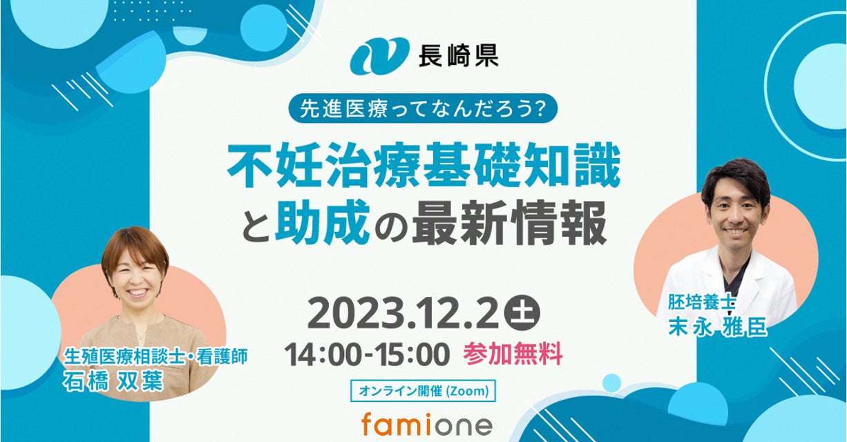 「子どもを願うすべての人によりそい 幸せな人生を歩める社会をつくる」をビジョンに掲げ、LINEを活用した妊活コンシェルジュサービス「famione(ファミワン)」 https://lp.famione.com/ を提供する株式会社ファミワン(本社:東京都渋谷区、代表取締役:石川勇介、以下当社)は、長崎県(知事:大石賢吾)からの委託を受け行なっている「妊活LINEサポート事業」の一環として、オンラインセミナー「先進医療ってなんだろう~不妊治療の基礎知識と長崎県における助成の最新情報~」 を12月2日に開催します。