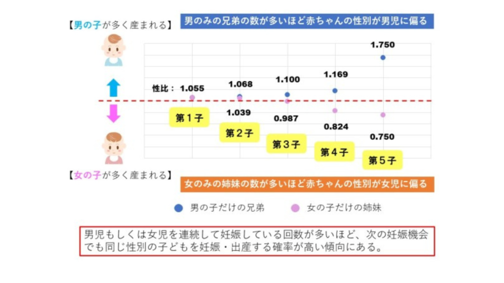 3. アジアにおける研究: 中国やインドでも、特に男児が望まれる文化的背景から、第一子、第二子が男児であれば、第三子も男児である可能性が高いとされています。