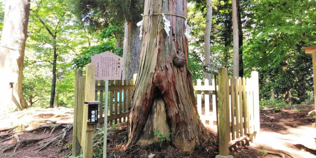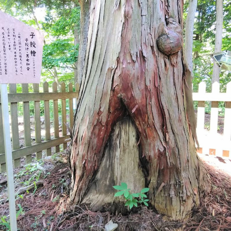 二股に分かれた根元部分に、突き刺さったように見える幹が男女和合のしるしとされるご神木です。