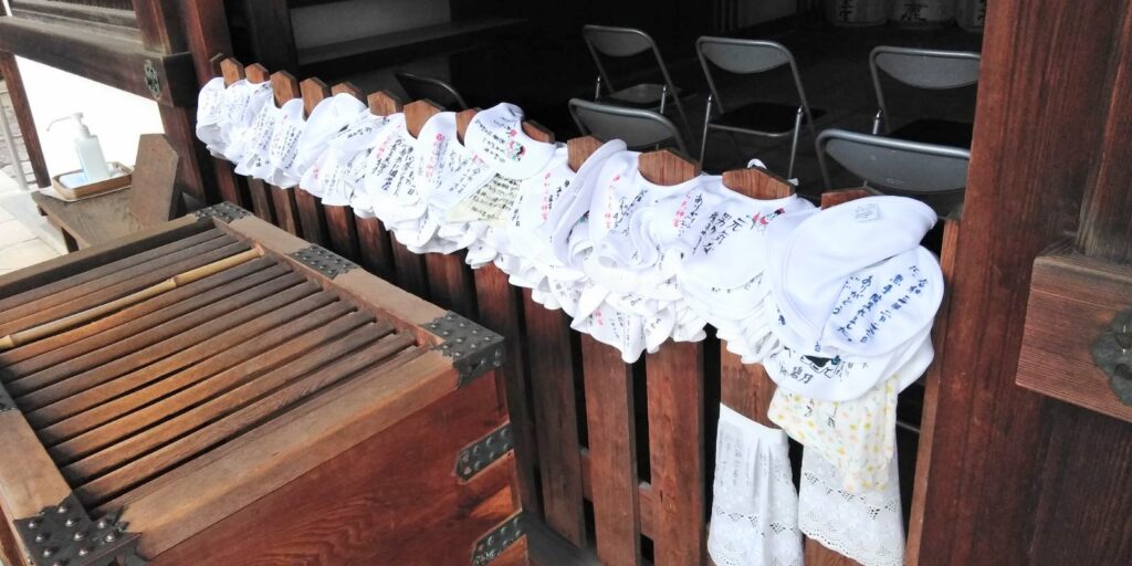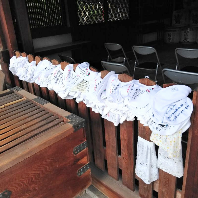 この前掛けは、出産後のお礼参りで感謝の気持ち等を書かれたものになります。子授けを祈願され、無事に出産された方々が、こんなにもたくさんおられるということを目にしつつ、ご自身たちパートナーも子授かりをしたイメージを抱きつつ参拝されることをおススメします。